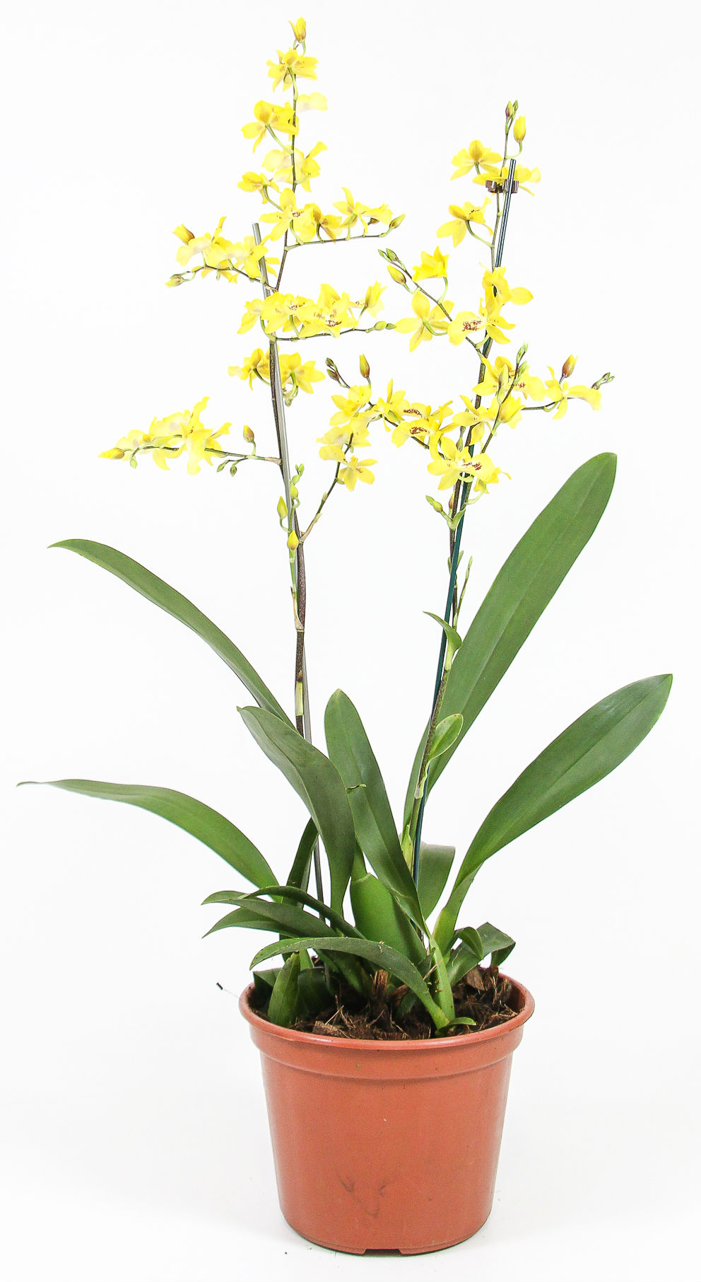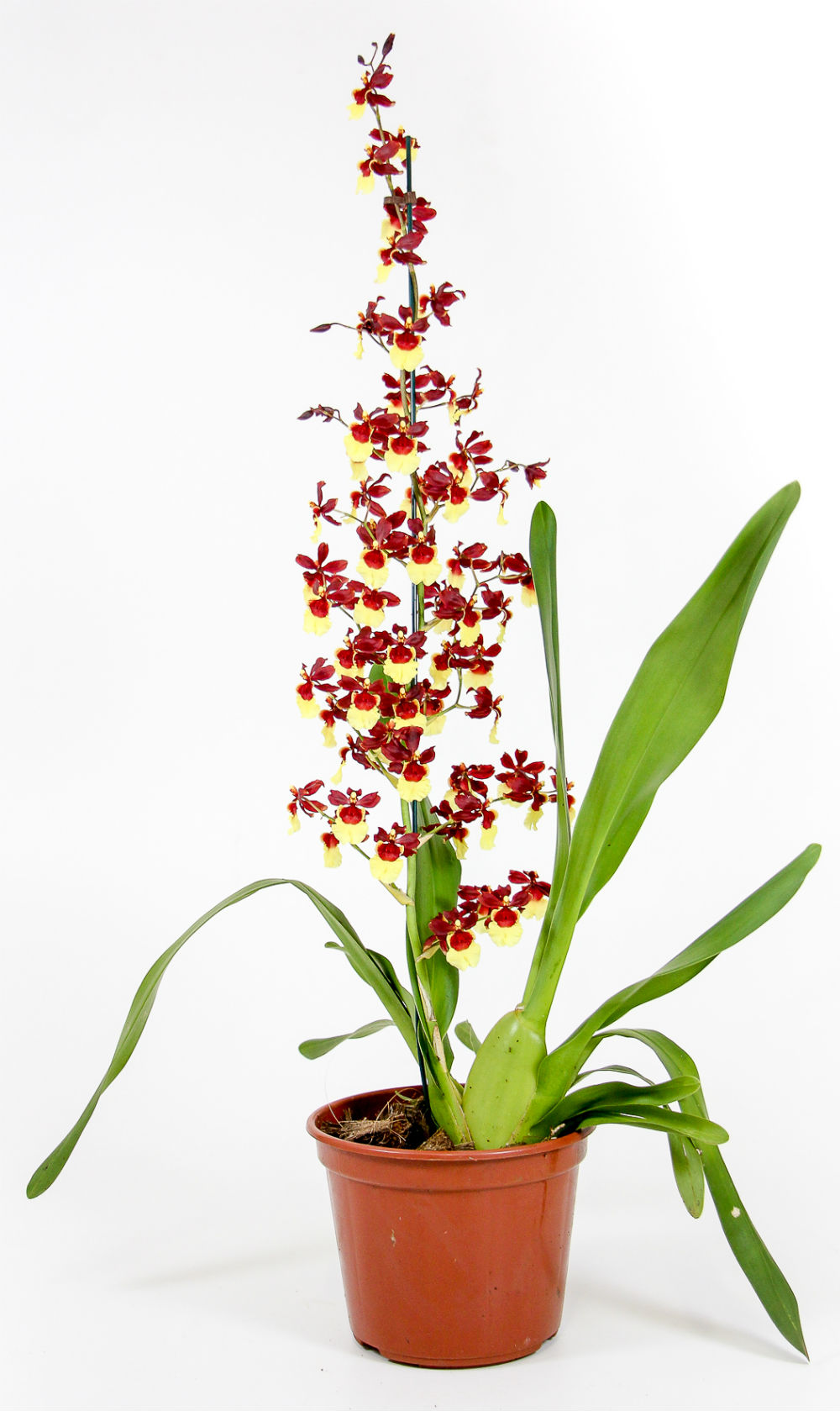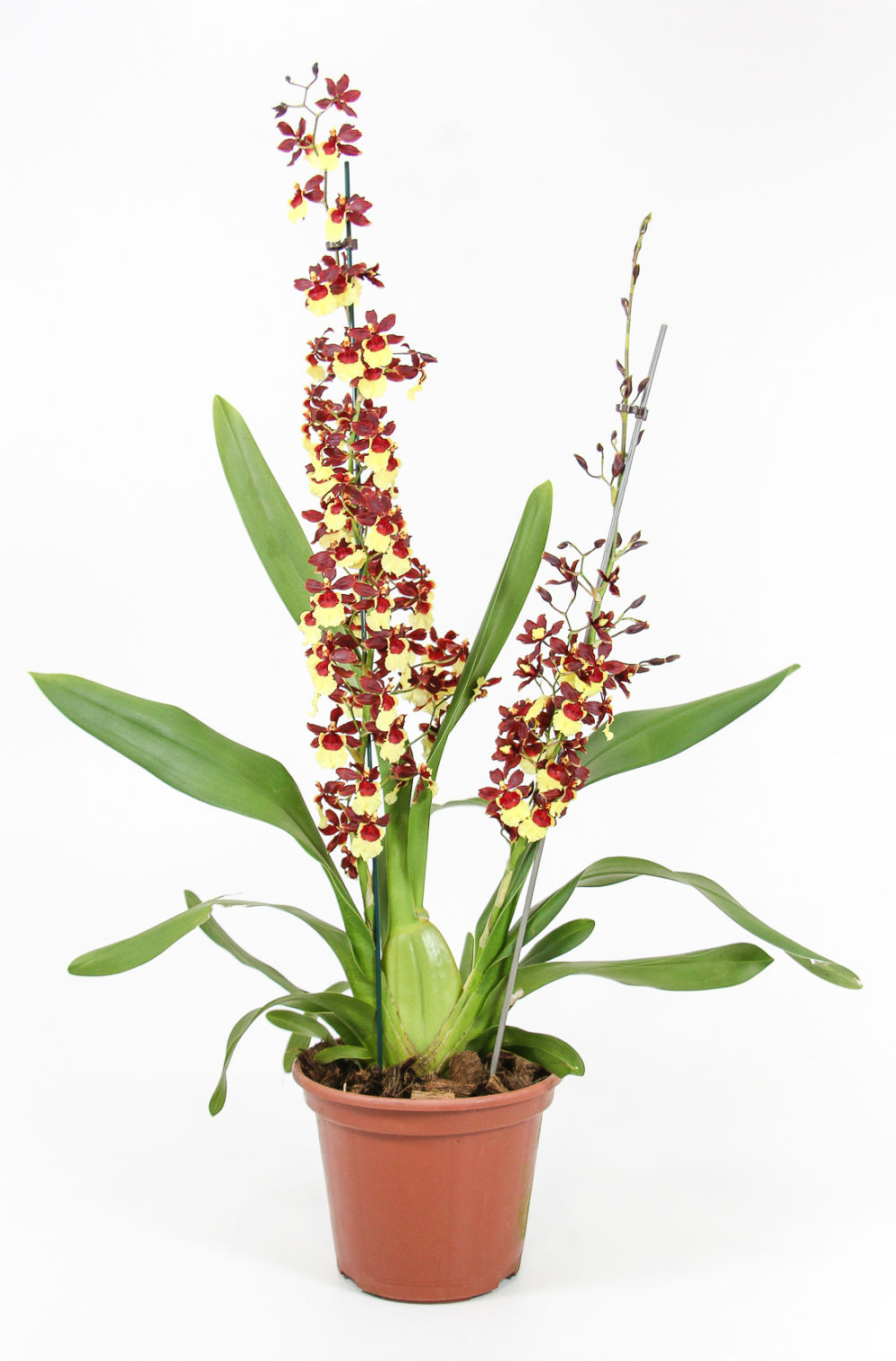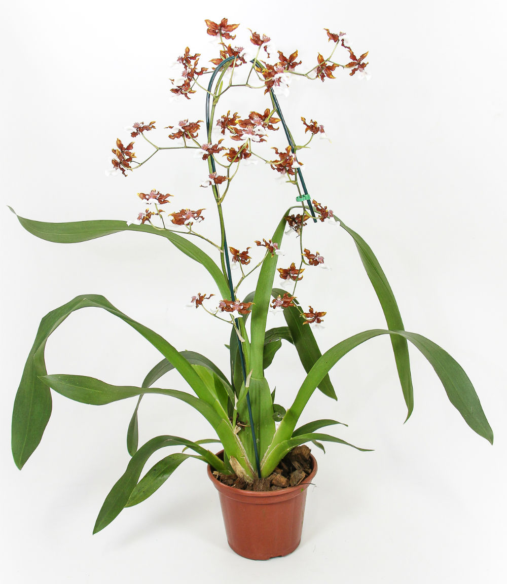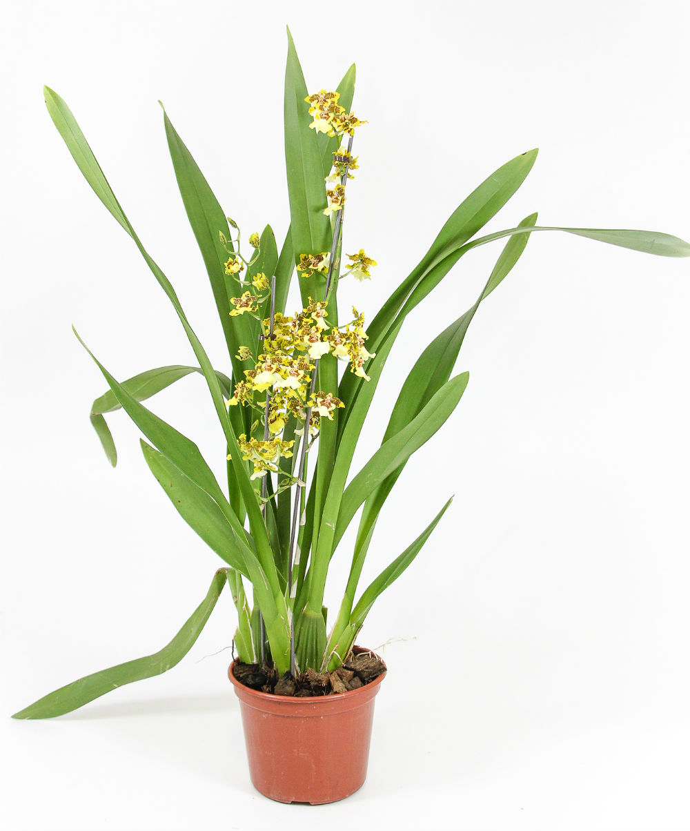 Oncidium: Gênero de orquídeas largamente distribuído do México ao sul da América do Sul. Essa orquídea possui as pétalas pequenas e delicadas. Em sua versão de flores amarelas é popularmente conhecida como Chuva de Ouro, já a versão em flores marrons leva o nome popular de Orquídea Chocolate. Mas é encontrada também nas cores verde, alaranjada, branca, rosas e não raramente tigradas. Cuidar de uma Oncidium é bastante simples, a orquídea necessita de água 1 vez por semana, deve-se escoar bem e nunca deixar água no prato pois a raiz pode apodrecer. Em caso de dúvida, coloque a ponta do dedo no substrato da orquídea, se estiver úmido não precisa regar. De fácil cuidado, pode ser considerada orquídea de apartamento e locais fechados. Suas flores duram de 20 a 30 dias.