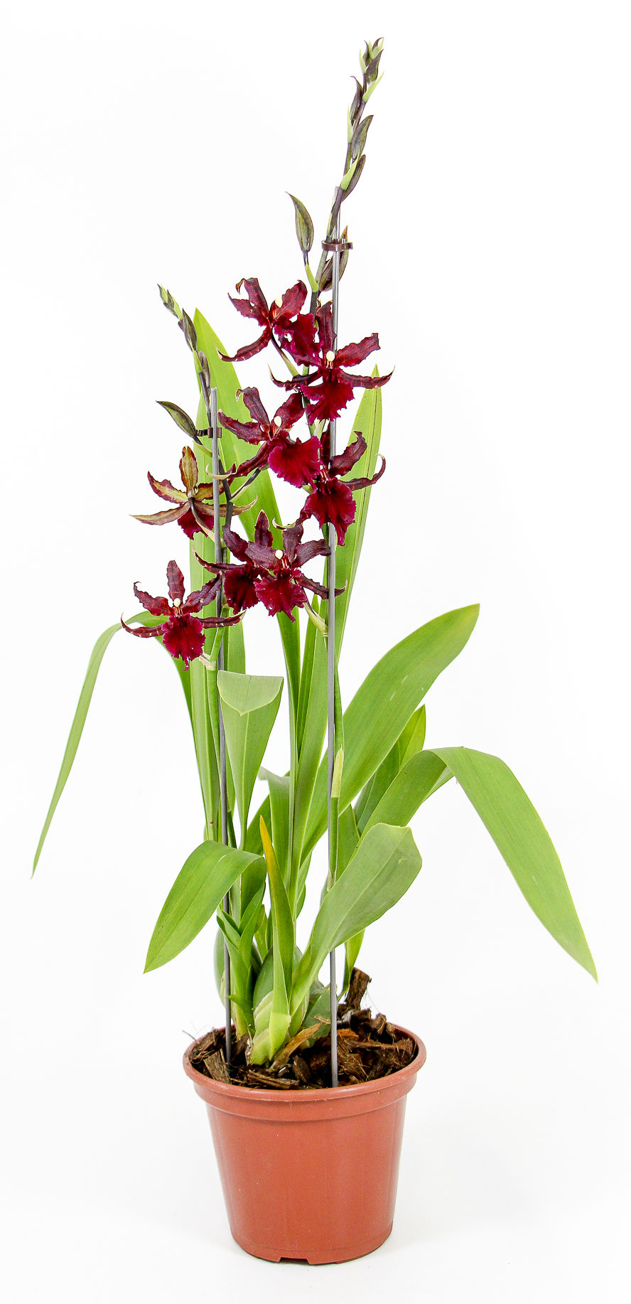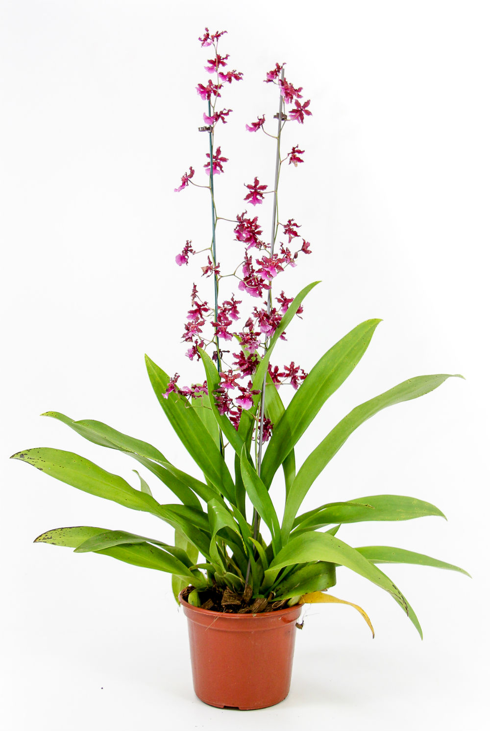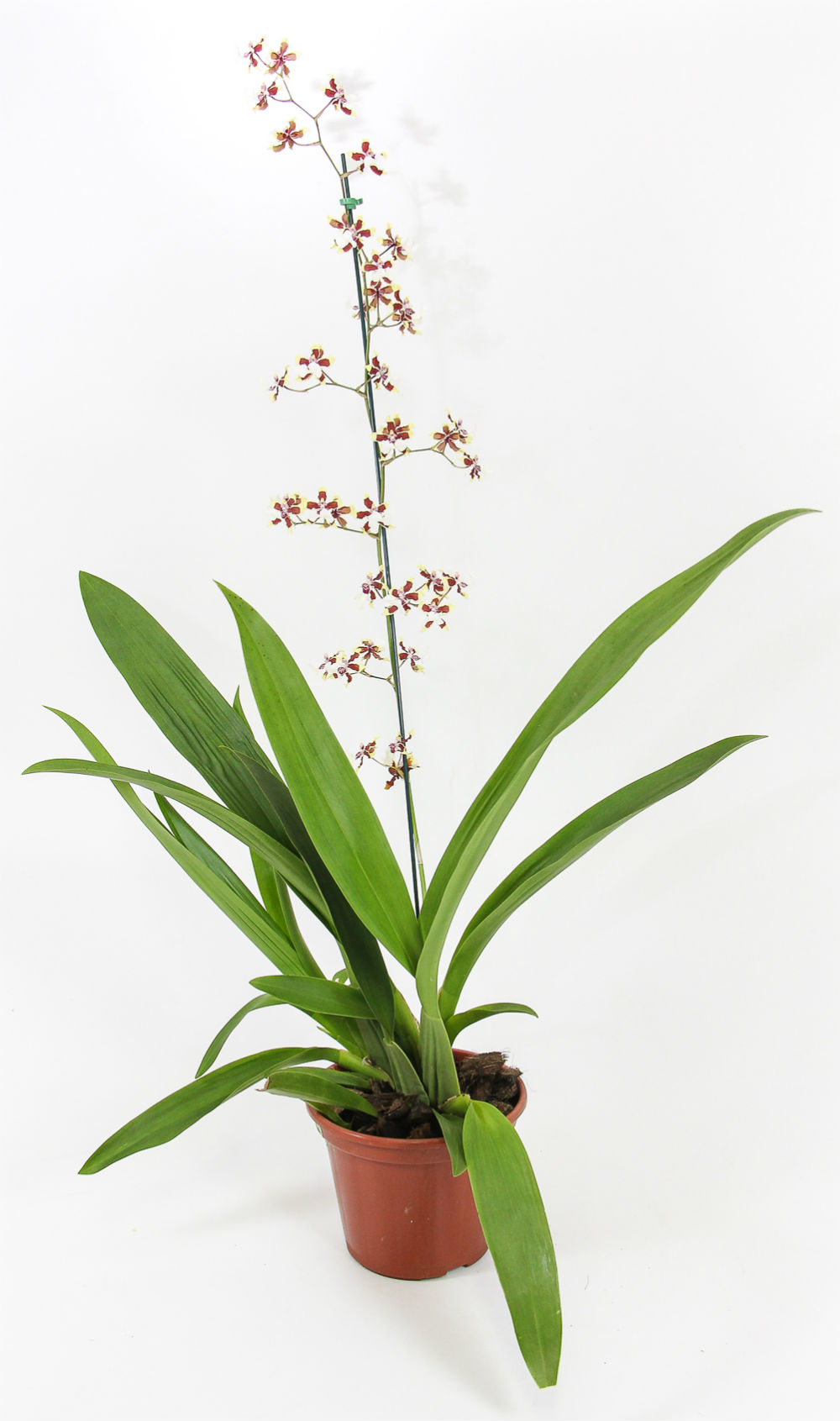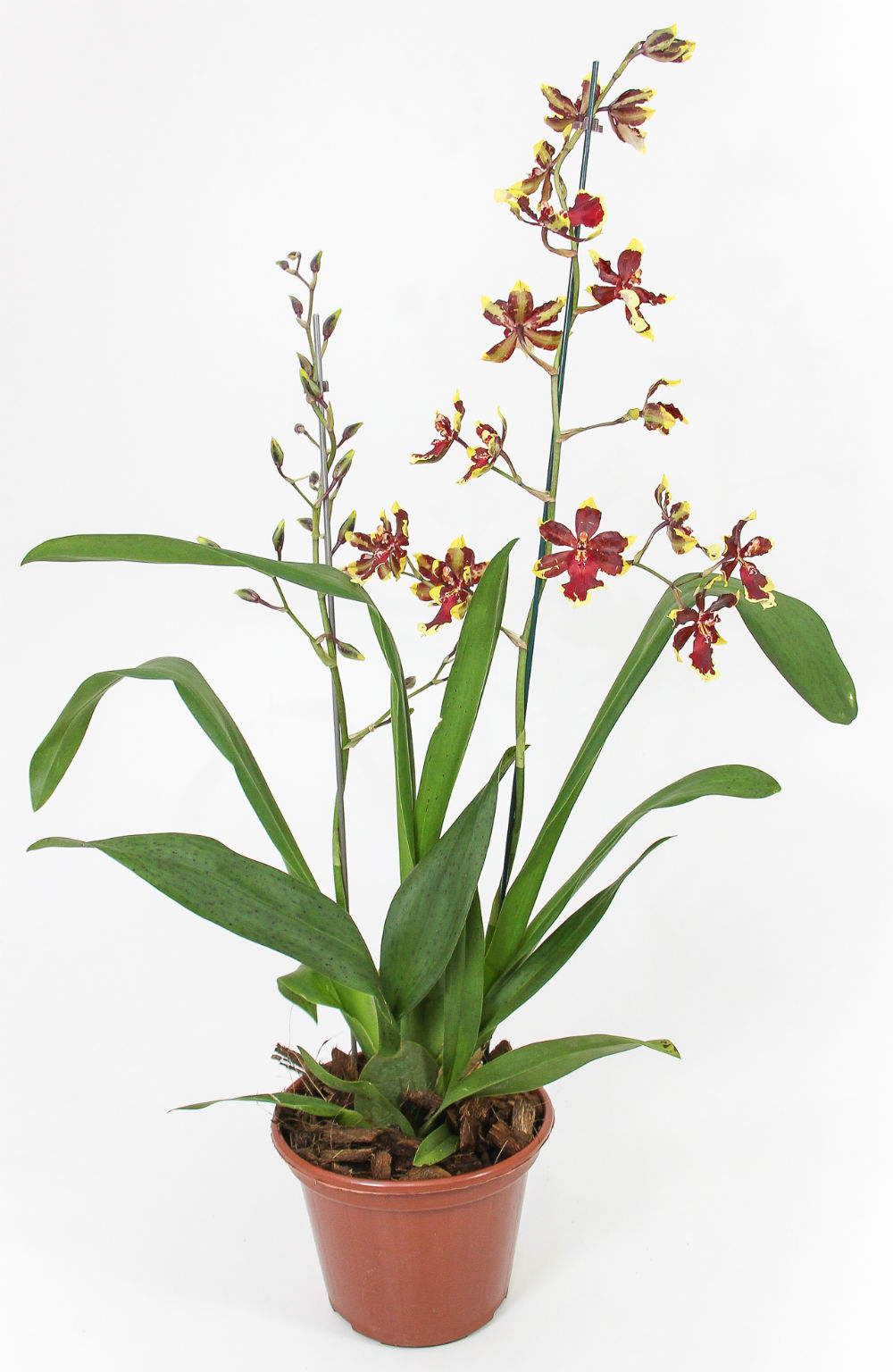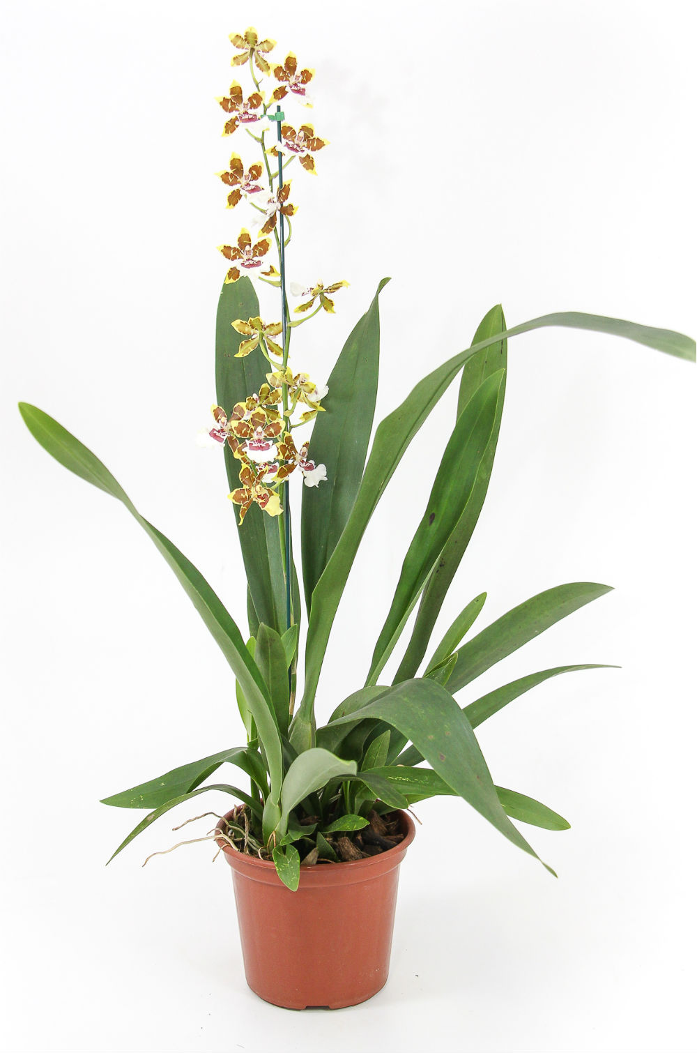 Oncidium: Gênero de orquídeas largamente distribuído do México ao sul da América do Sul. Essa orquídea possui as pétalas pequenas e delicadas. Em sua versão de flores amarelas é popularmente conhecida como Chuva de Ouro, já a versão em flores marrons leva o nome popular de Orquídea Chocolate. Mas é encontrada também nas cores verde, alaranjada, branca, rosas e não raramente tigradas. Cuidar de uma Oncidium é bastante simples, a orquídea necessita de água 1 vez por semana, deve-se escoar bem e nunca deixar água no prato pois a raiz pode apodrecer. Em caso de dúvida, coloque a ponta do dedo no substrato da orquídea, se estiver úmido não precisa regar. De fácil cuidado, pode ser considerada orquídea de apartamento e locais fechados. Suas flores duram de 20 a 30 dias.