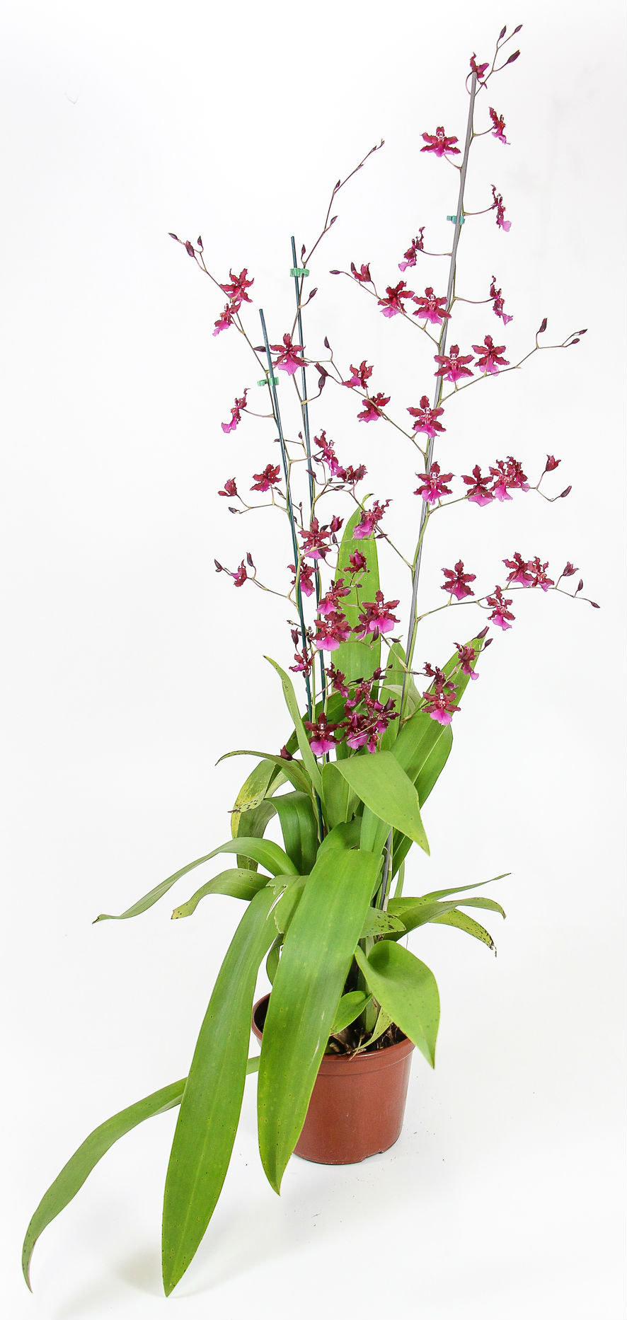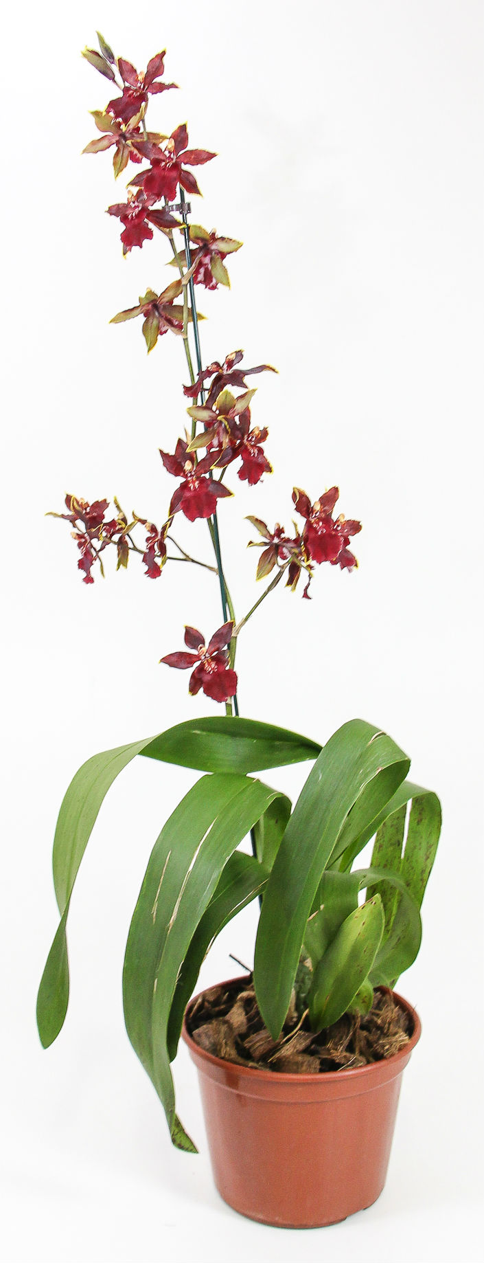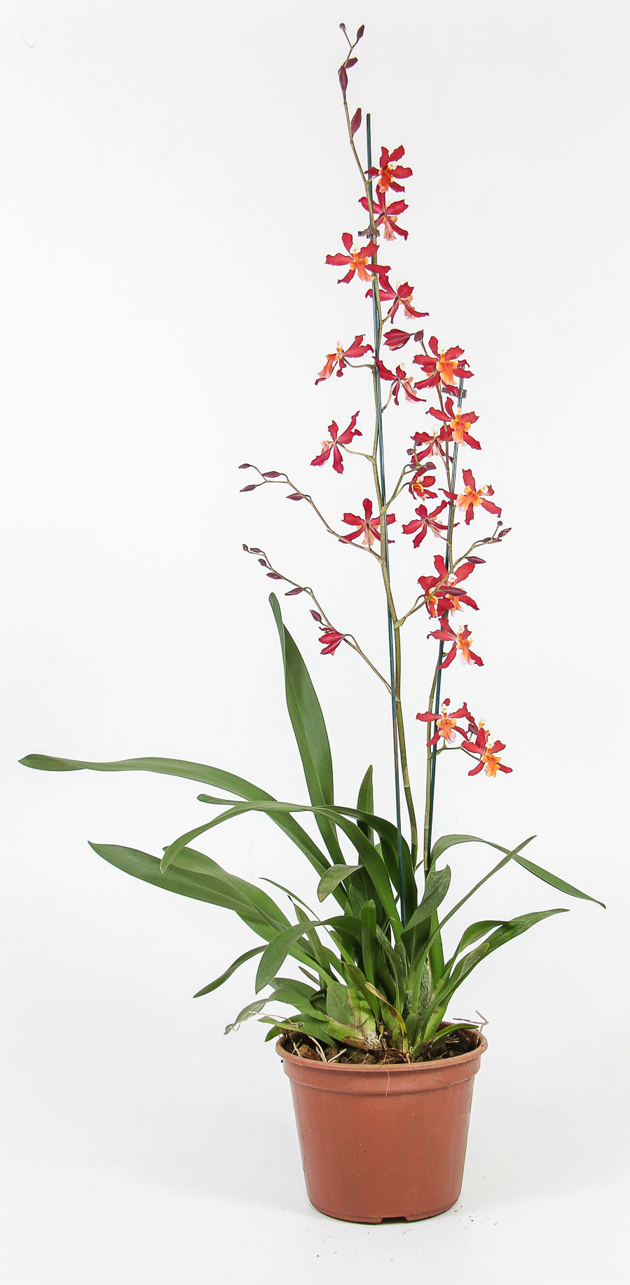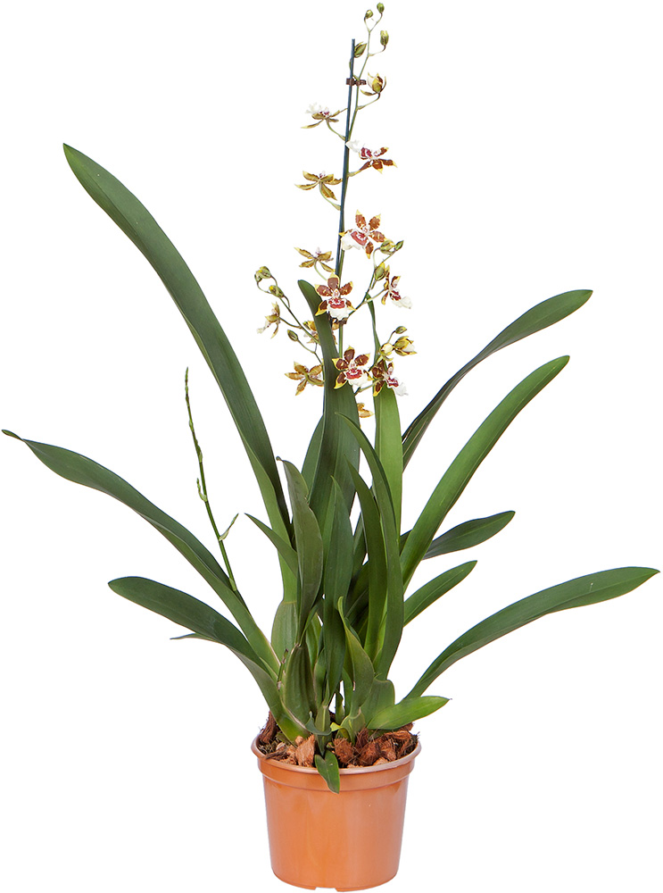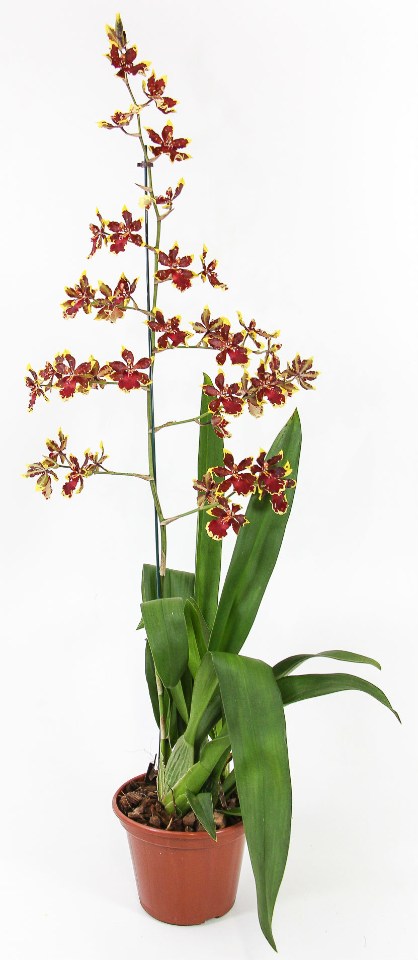 Oncidium: Gênero de orquídeas largamente distribuído do México ao sul da América do Sul. Essa orquídea possui as pétalas pequenas e delicadas. Em sua versão de flores amarelas é popularmente conhecida como Chuva de Ouro, já a versão em flores marrons leva o nome popular de Orquídea Chocolate. Mas é encontrada também nas cores verde, alaranjada, branca, rosas e não raramente tigradas. Cuidar de uma Oncidium é bastante simples, a orquídea necessita de água 1 vez por semana, deve-se escoar bem e nunca deixar água no prato pois a raiz pode apodrecer. Em caso de dúvida, coloque a ponta do dedo no substrato da orquídea, se estiver úmido não precisa regar. De fácil cuidado, pode ser considerada orquídea de apartamento e locais fechados. Suas flores duram de 20 a 30 dias.